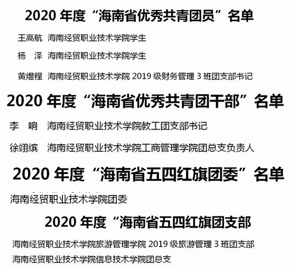近日,共青团海南省委表彰了一批在2020年以来全省共青团工作中成绩突出的个人和集体。beats365亚洲版官网教师范高智获得第二十七届“海南青年五四奖章”,王高航、杨泽、黄煜程等三位同学获得“海南省优秀共青团员”称号,李响、徐翊缤两位教师获得“海南省优秀共青团干部”称号,校团委获得“海南省五四红旗团委”,旅游管理学院2019级旅游管理3班团支部、信息技术学院团总支获得“海南省五四红旗团支部(团总支)”。