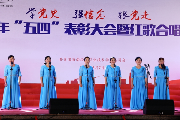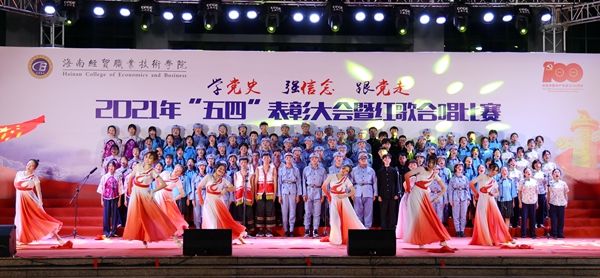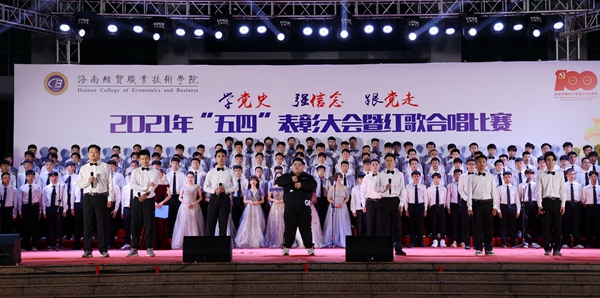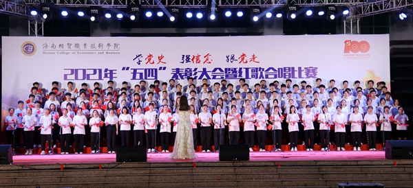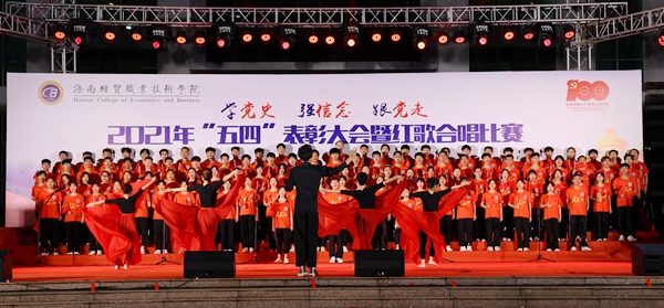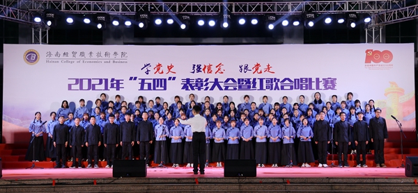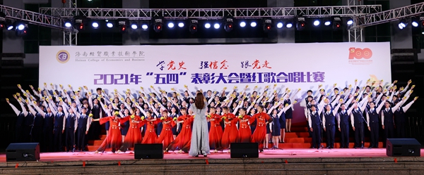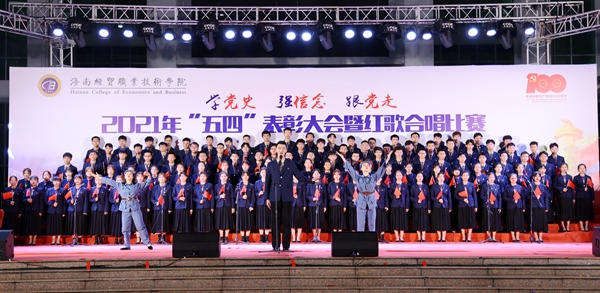 表彰会后,“学党史、强信念、跟党走”红歌合唱比赛在学生艺术团《我的祖国》歌声中拉开帷幕。来自二级学院的8支参赛队伍先后为现场观众带来了《爱我中华》《走向复兴》、《我和我的祖国》《我爱你,中国》《太阳最红,毛主席最亲》《边疆泉水清又纯》《党旗飘扬的地方》《在灿烂阳光下》等歌颂祖国和歌颂党百年光辉历程的红色歌曲。各参赛队伍在合唱中通过舞蹈、朗诵等演绎方式创新比赛内容与形式,热情讴歌在中国共产党领导下,中华民族取得的各项成就,展示了beats365亚洲版官网青年为海南自贸港建设、为实现中华民族伟大复兴而奋斗的决心。随后,红星艺术团带来的歌曲《绣红旗》与学生艺术团合唱队带来的《少年》掀起了整场活动的高潮。整场比赛气势恢宏,高潮迭起,赢得了在场师生的阵阵掌声。