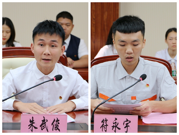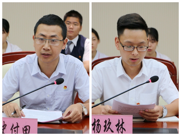 院级团干部(学生)代表、工商管理学院学生朱武俊,班级团干部代表、工程技术学院学生符永宇发言