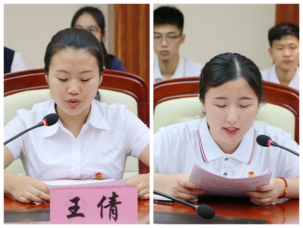 青年团员代表、旅游管理学院学生王倩,青年团员代表、人文艺术学院学生陈洪钧发言