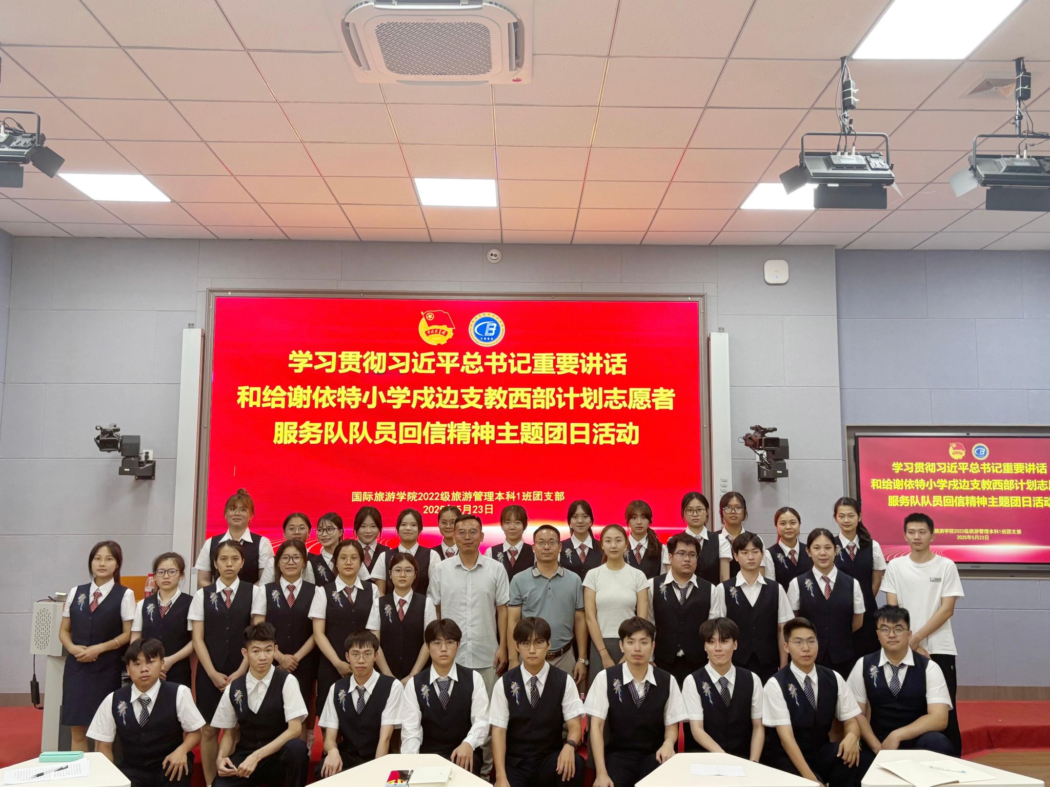 为深入学习宣传贯彻习近平总书记重要讲话和给谢依特小学戍边支教西部计划志愿者服务队队员回信精神,动员引领团员青年到祖国和人民最需要的地方发光发热,在中国式现代化建设中挺膺担当。5月23日下午,国际旅游学院2022级旅游管理本科1班团支部在第一教学楼104室开展“学习贯彻习近平总书记重要讲话和给谢依特小学戍边支教西部计划志愿者服务队队员回信精神”主题团日活动。