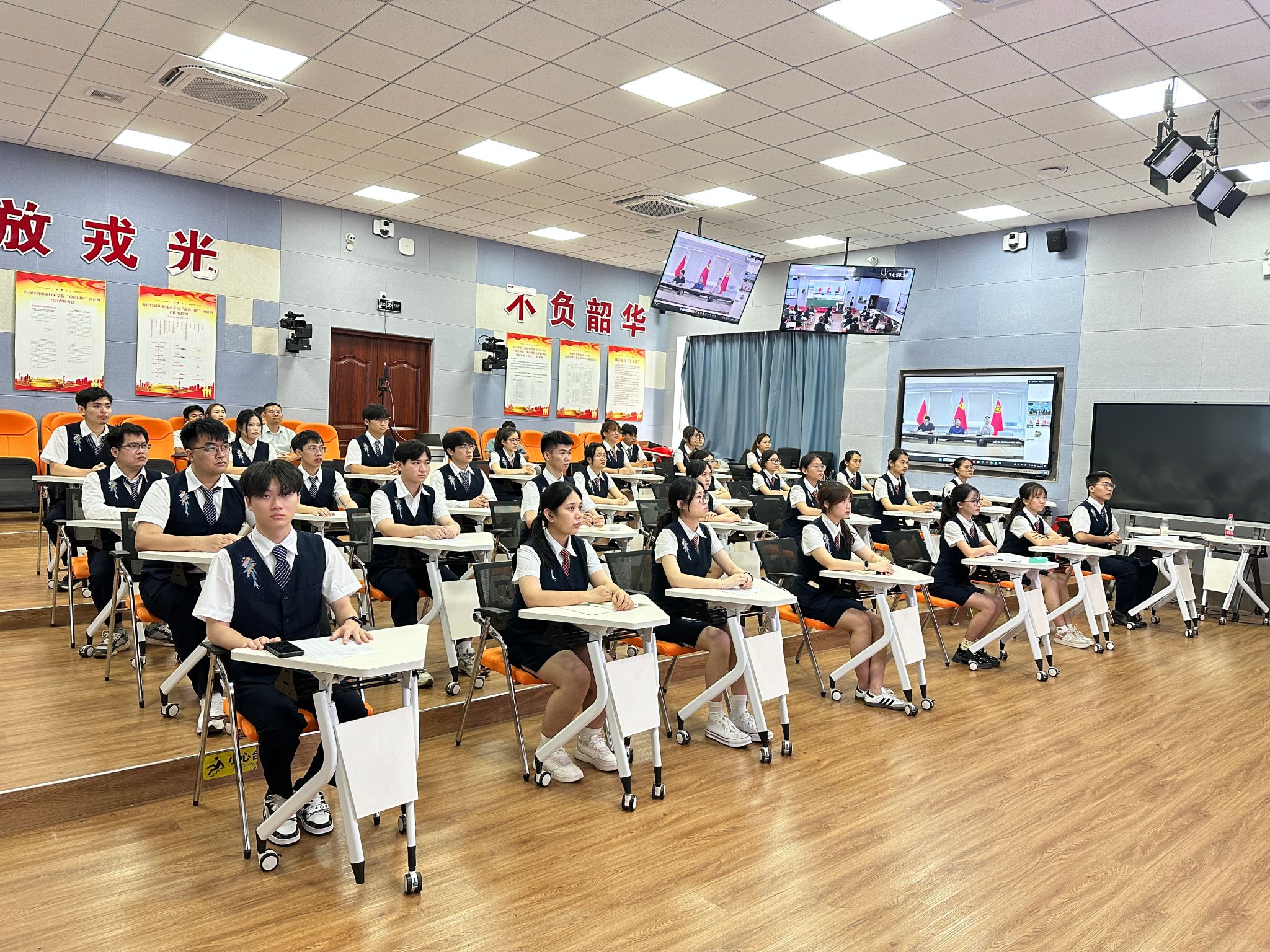 团支部成员、优秀青年志愿者代表林智慧同学结合自身志愿服务经历,讲述了在海南万宁支教的故事,分享了在服务过程中的成长与收获。团支部成员、第十四届“挑战杯”秦创原中国大学生创业计划竞赛金奖团队成员代表黄循易同学结合创新创业团队获奖案例,讲解了项目培育路径和参赛经历,分享了在创新创业方面青春励志的奋斗故事和收获感悟。