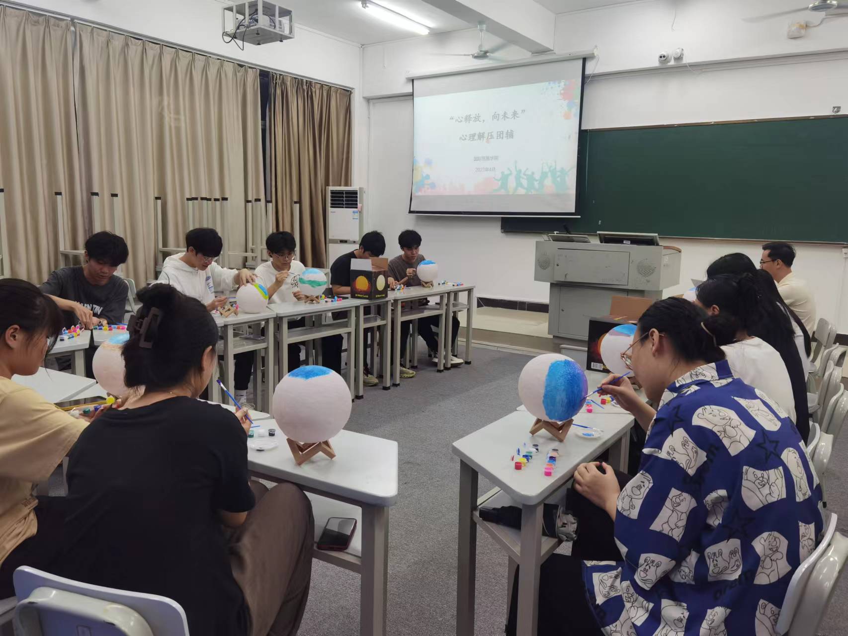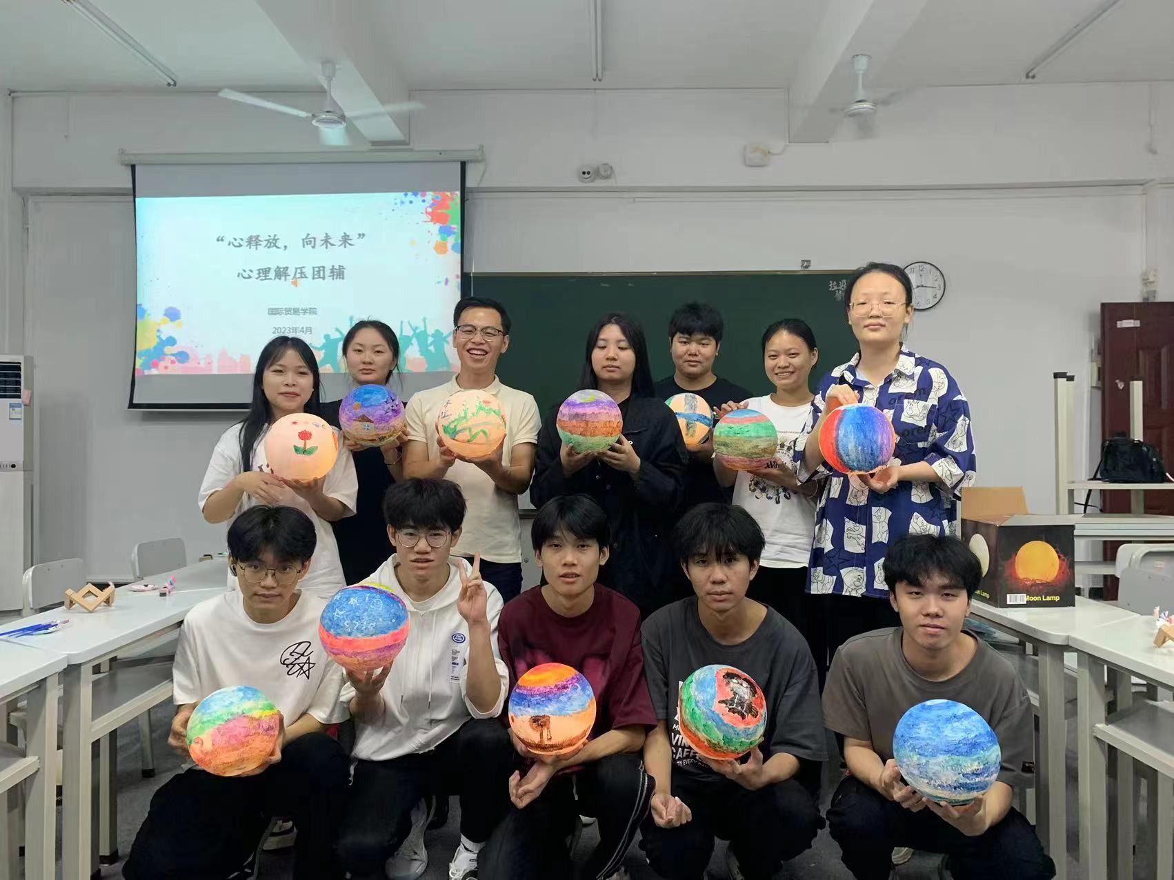 为进一步提升心理育人工作质量,引导学生关注自身心理精神世界,提高学生心理自助能力和心理健康水平,在国际“5.25心理健康日”即将来临之际,国际贸易学院于4月22日晚在1-501教室开展了“心释放,向未来”主题DIY手工心理解压团辅活动。辅导员印华和赵会达参加本次活动。