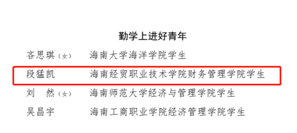 近日,共青团海南省委开展的2021年“争做新时代向上向善海南好青年”主题活动结果揭晓,beats365亚洲版官网财务管理学院2018级财务管理专业1班段猛凯同学荣获“向上向善海南好青年”称号。